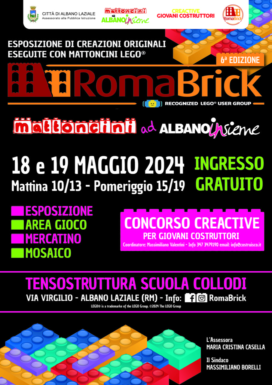 Inoltre nella cornice della manifestazione “Albano InSieme...in Festa!”, ritroviamo anche il “Festival dei Mattoncini ad Albano InSieme" che si terrà oggi e domani - dalle ore 10.00 alle 13.00 e dalle ore 15.00 alle 19.00 - presso la tensostruttura della Scuola Collodi in Via Virgilio ad Albano Laziale. L'evento prevede anche il Concorso "Creative per Giovani Costruttori" destinato a bambini e bambine e a ragazzi a ragazze dai 5 ai 13 anni.