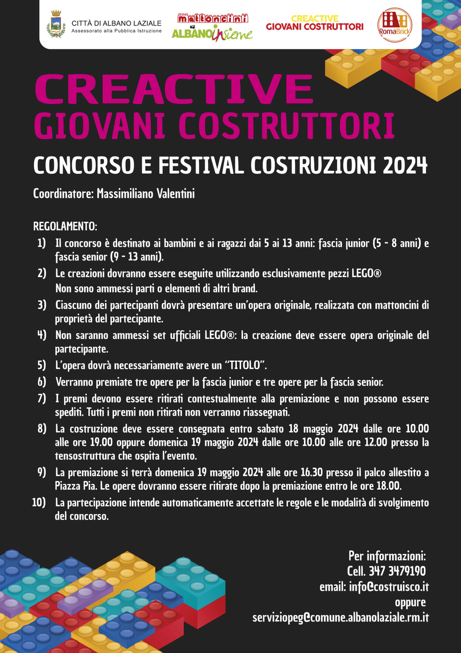 Inoltre nella cornice della manifestazione “Albano InSieme...in Festa!”, ritroviamo anche il Festival dei Mattoncini ad Albano InSieme" che si terrà oggi e domani - dalle ore 10.00 alle 13.00 e dalle ore 15.00 alle 19.00 - presso la tensostruttura della Scuola Collodi in Via Virgilio ad Albano Laziale. L'evento prevede anche il Concorso "Creative per Giovani Costruttori" destinato a bambini e bambine e a ragazzi a ragazze dai 5 ai 13 anni.