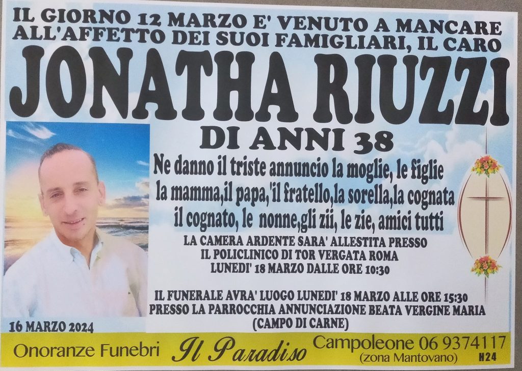 Questo lunedì 18 marzo ad Aprilia i funerali del 38enne Jonatha Riuzzi, deceduto lo scorso martedì a Lariano.