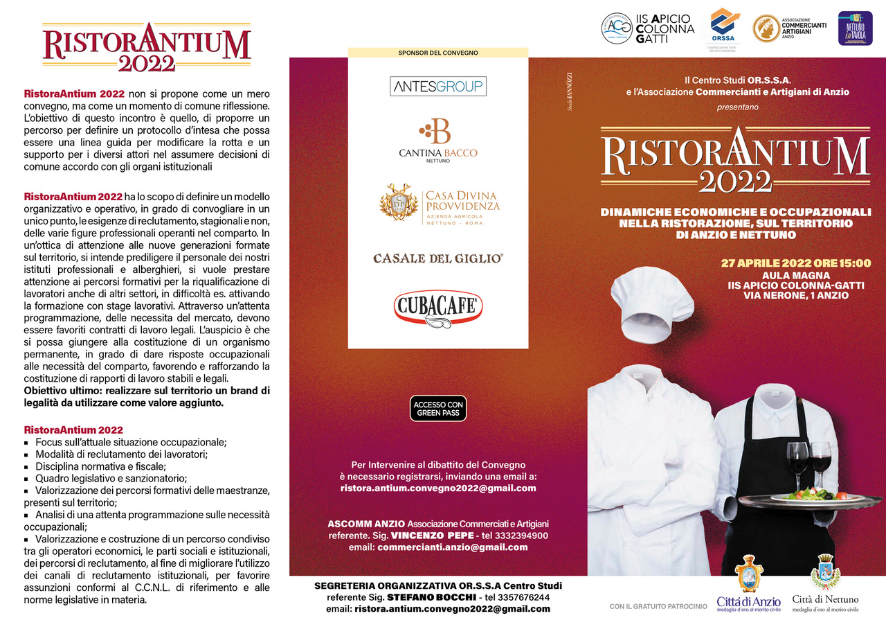 Questo mercoledì ad Anzio il convegno “Ristora Antium” sulle dinamiche economiche e occupazionali nella ristorazione sul territorio di Anzio e Nettuno. L’appuntamento - organizzato dal Centro Studi OR.S.S.A. e dall’associazione Commercianti e Artigiani di Anzio - è per domani pomeriggio a partire dalle 15.00 presso l’Aula Magna dell’Istituto Apicio-Colonna Gatti di Anzio.
