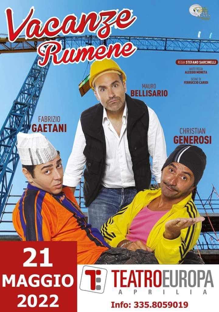 Questo sabato 21 Maggio al Teatro Europa di Aprilia l’esilarante commedia “Vacanze Rumene”. Sul palco  Fabrizio Gaetani, Mauro Bellisario e Christian Generosi. Il sipario si alza alle 21.00.Una esilar...