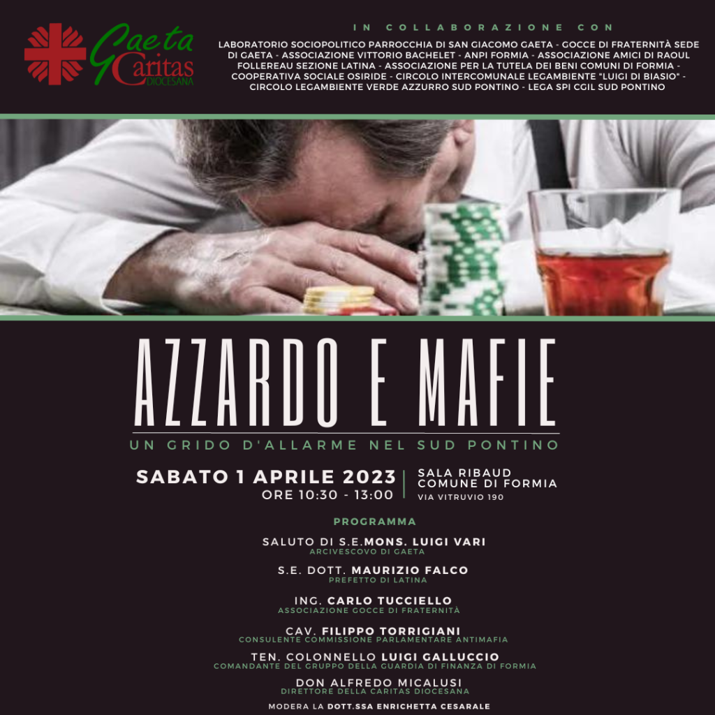 Di fronte a questa problematica, la Caritas di Gaeta, da tempo impegnata a contrastare la diffusione delle ludopatie, in collaborazione con le associazioni che hanno aderito al Tavolo di Cittadinanza Attiva (il Laboratorio sociopolitico Parrocchia di San Giacomo Gaeta, l’Associazione Gocce di Fraternità sede di Gaeta, l’Associazione Vittorio Bachelet, l’ANPI Formia, l’Associazione Amici di Raoul Follereau sezione Latina, l’Associazione per la tutela dei Beni Comuni di Formia, la Cooperativa Sociale Osiride, il Circolo intercomunale Legambiente “Luigi Di Biasio”, il Circolo Legambiente Verde Azzurro Sud Pontino, la Lega SPI CGIL Sud Pontino), organizza il convegno “Azzardo e mafie: un grido di allarme nel Sud Pontino”.