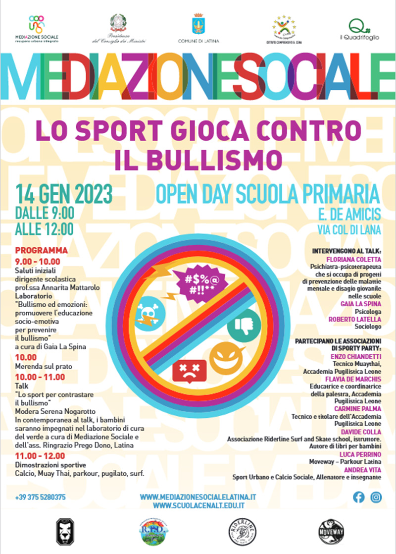 Questo sabato 14 Gennaio a Latina al quartiere Nicolosi l’evento “Lo sport gioca contro il bullismo” organizzato nell’ambito del progetto “Mediazione Sociale”. L’iniziativa - a cura della cooperativa sociale “Il Quadrifoglio” – è stata organizzata in occasione del secondo Open Day della scuola primaria “De Amicis” di via Col di Lana, appartenente all’Istituto Compresivo “Giovanni Cena”. L’appuntamento è dalle 9.00 alle 12.00.