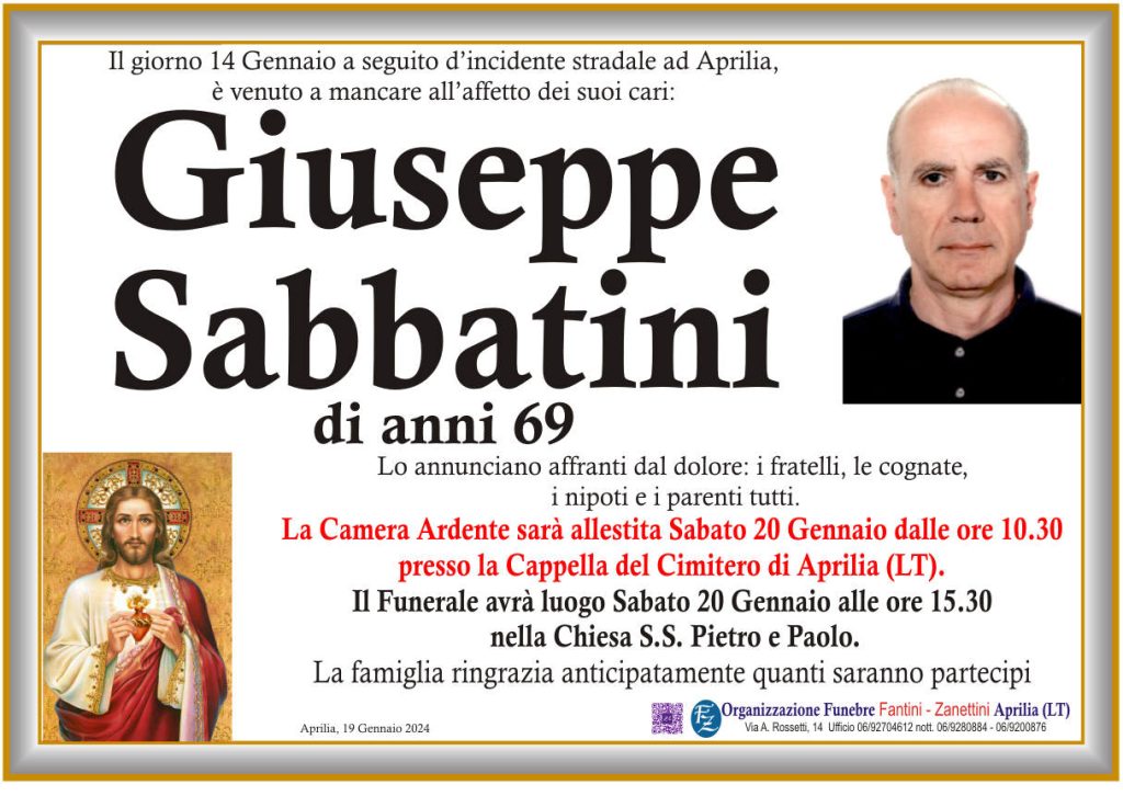 Questo sabato ad Aprilia i funerali di Giuseppe Sabbatini, il 69enne appassionato di ciclismo travolto e ucciso da un’auto, la scorsa domenica pomeriggio, mentre percorreva via Carano in bicicletta. L...