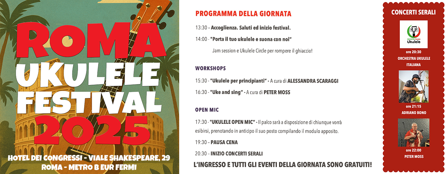Roma apre le porte al suono brillante ed inclusivo dell’ukulele con la prima edizione del “Roma Ukulele Festival 2025”, che si terrà sabato 6 dicembre presso l’Hotel dei Congressi. Una giornata di mus...