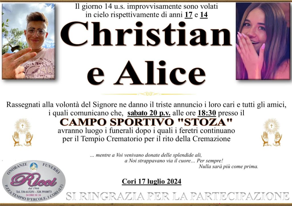 Questo sabato nell'impianto sportivo di Stoza a Cori i funerali di Alice e Christian