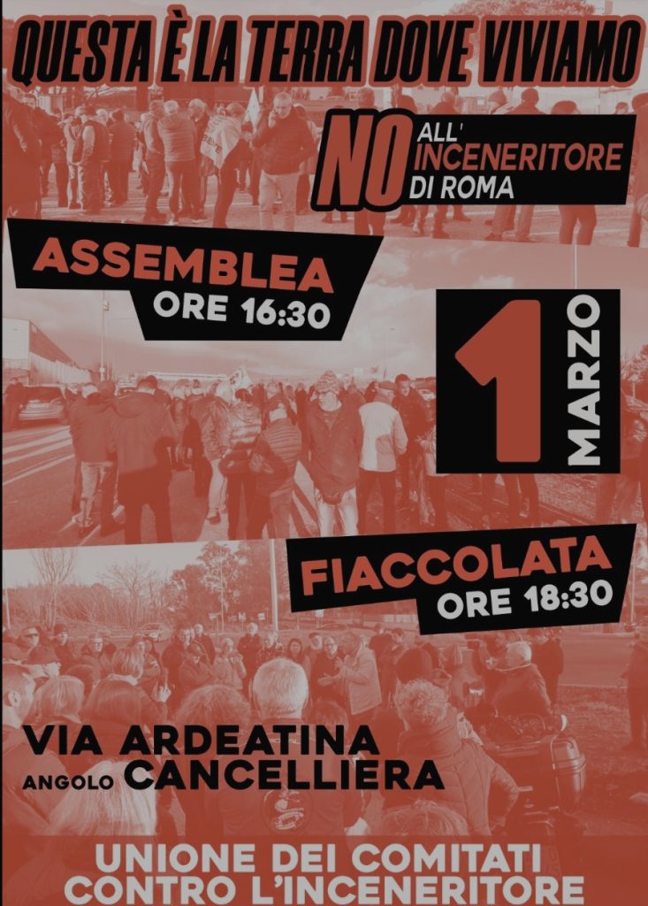 Questo venerdì a Santa Palomba il presidio e la fiaccolata dell’unione dei comitati contro l’inceneritore. L’appuntamento è alle 16.30 davanti al sito dove dovrebbe sorgere il termo inceneritore voluto dal Comune di Roma, sulla via Ardeatina, all’angolo con via Cancelliera. Ci sarà prima un’assemblea, poi alle 18.30 una fiaccolata.