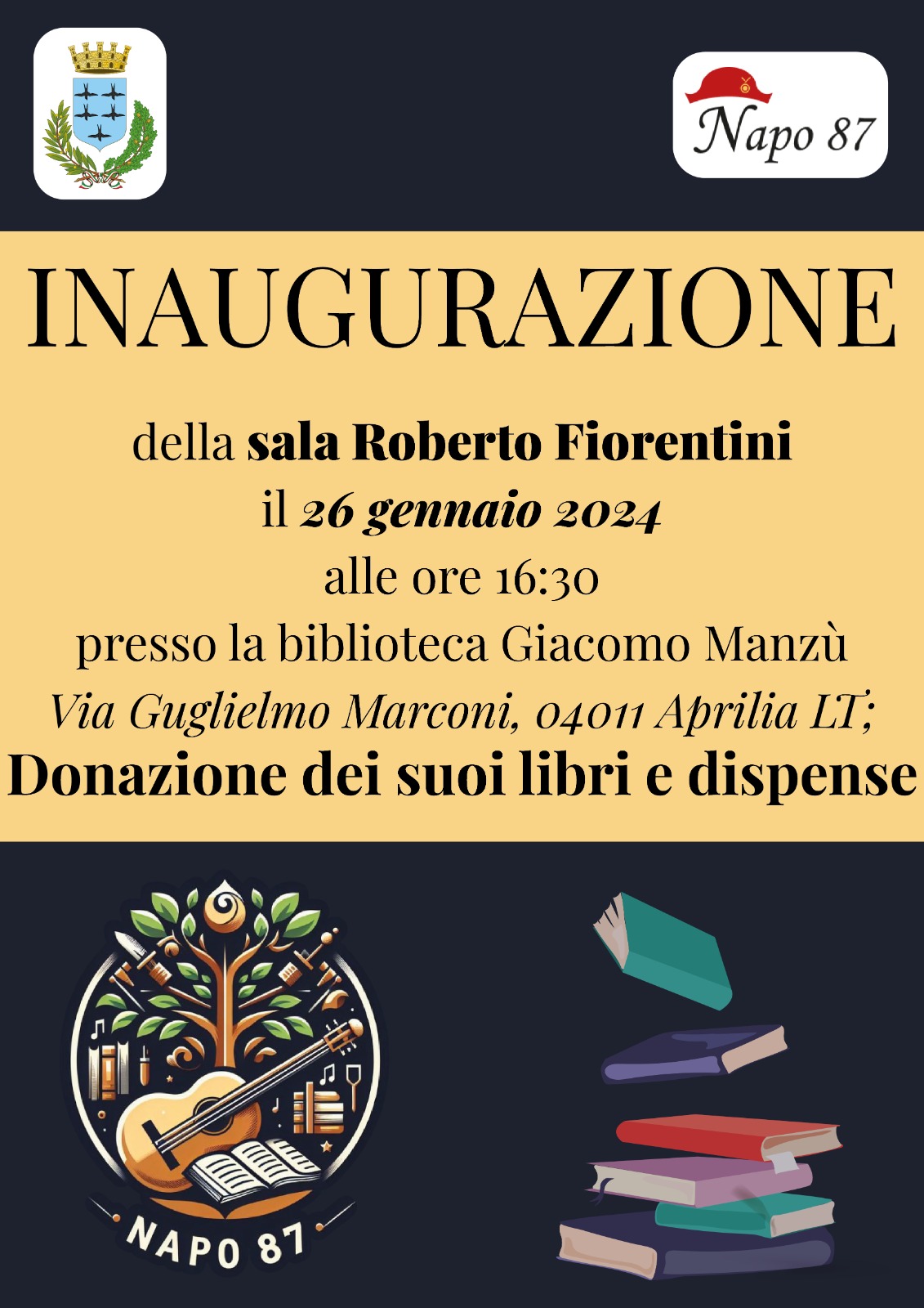 Questo venerdì 26 gennaio, alle 16.30, ad Aprilia ci sarà l’inaugurazione della sala intitolata a “Roberto Fiorentini” presso la biblioteca comunale di Largo Marconi. L’associazione Napo87, intitolata a Roberto Fiorentini, donerà alla biblioteca i suoi libri e le sue dispense.