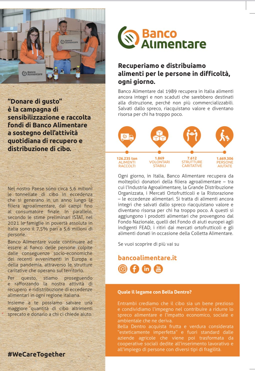 Banco Alimentare continua a sostenere le circa 7.600 strutture caritative in tutta Italia, che aiutano 1.700.000 persone in difficoltà, recupera le eccedenze alimentari dalla filiera agroalimentare, dalle aziende della ristorazione organizzata, dalle aziende della GDO, ed è un ente accreditato AGEA che gestisce le derrate alimentari del Fondo di aiuti europei agli indigenti e del Fondo Nazionale. Banco Alimentare inoltre organizza da 25 anni la Colletta Alimentare,nel 2021 sono state oltre 120mila le tonnellate distribuite di cibo, di cui 46mila salvate dallo spreco.