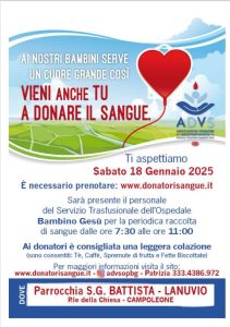Raccolta di sangue per l'ospedale Pediatrico Bambino Gesù: a Campoleone la mattina di sabato 18 gennaio il personale del Servizio trasfusionale sarà nel piazzale della chiesa San Giovanni Battista. P...