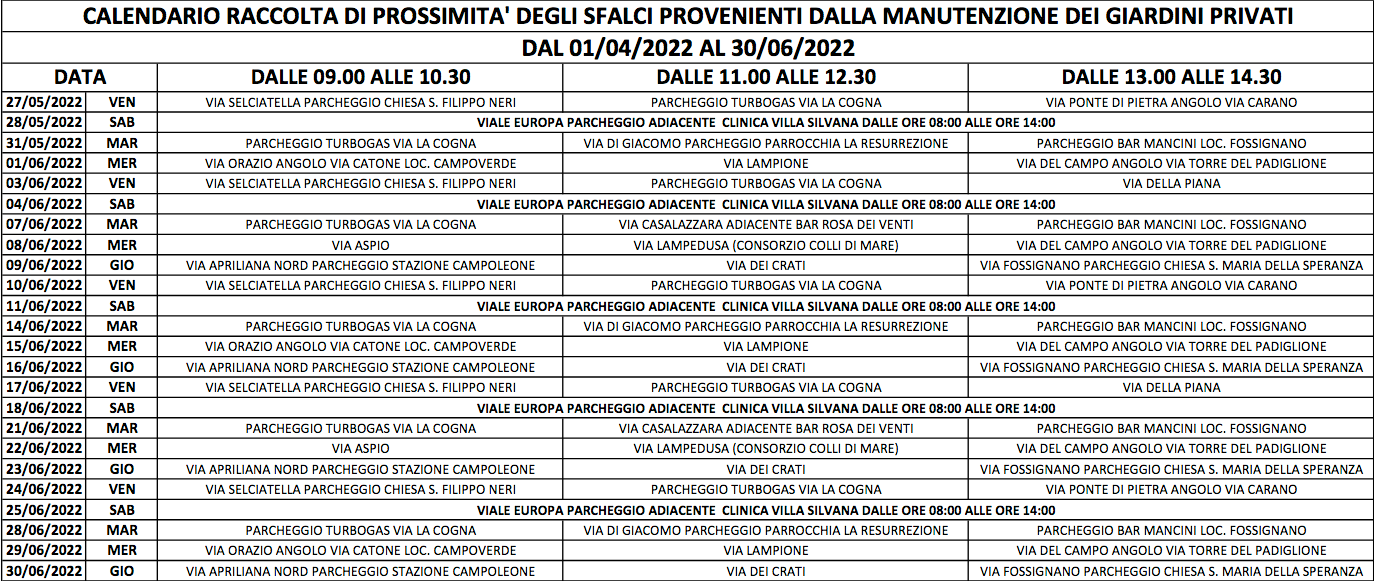 Raccolta itinerante degli sfalci: ecco il calendario della Progetto Ambiente di Aprilia valido sino al prossimo 30 Giugno.