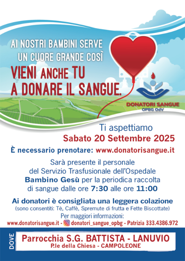 Una nuova giornata di raccolta sangue a Campoleone a favore dell’ospedale Pediatrico “Bambino Gesù” di Roma. L’appuntamento, organizzato dall’associazione “Donatori Volontari Sangue”, è per sabato 20 settembre, dalle 7.30 alle 11.00, nel piazzale della parrocchia “San Giovanni Battista” di Campoleone. Ai donatori è consigliata una leggera colazione.