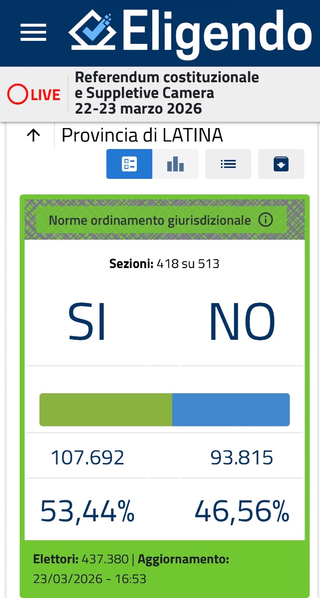 Referendum giustizia, anche nel Lazio vince il “no”. Trend diverso in provincia di Latina dove invece la maggioranza degli elettori pontini si è espresso per il “Sì”. Ad Aprilia vittoria schiacciate del No, un risultato pazzesco già sottolineato dalla coalizione di centro sinistra anche in relazione al dato legato all’affluenza. In provincia il No ha avuto più voti anche a Gaeta, Norma e Cori. Nel resto dei comuni pontini invece percentuali altissime per il Sì. Un risultato dunque quello che arriva dal territorio completamente in controtendenza rispetto al resto del Paese.