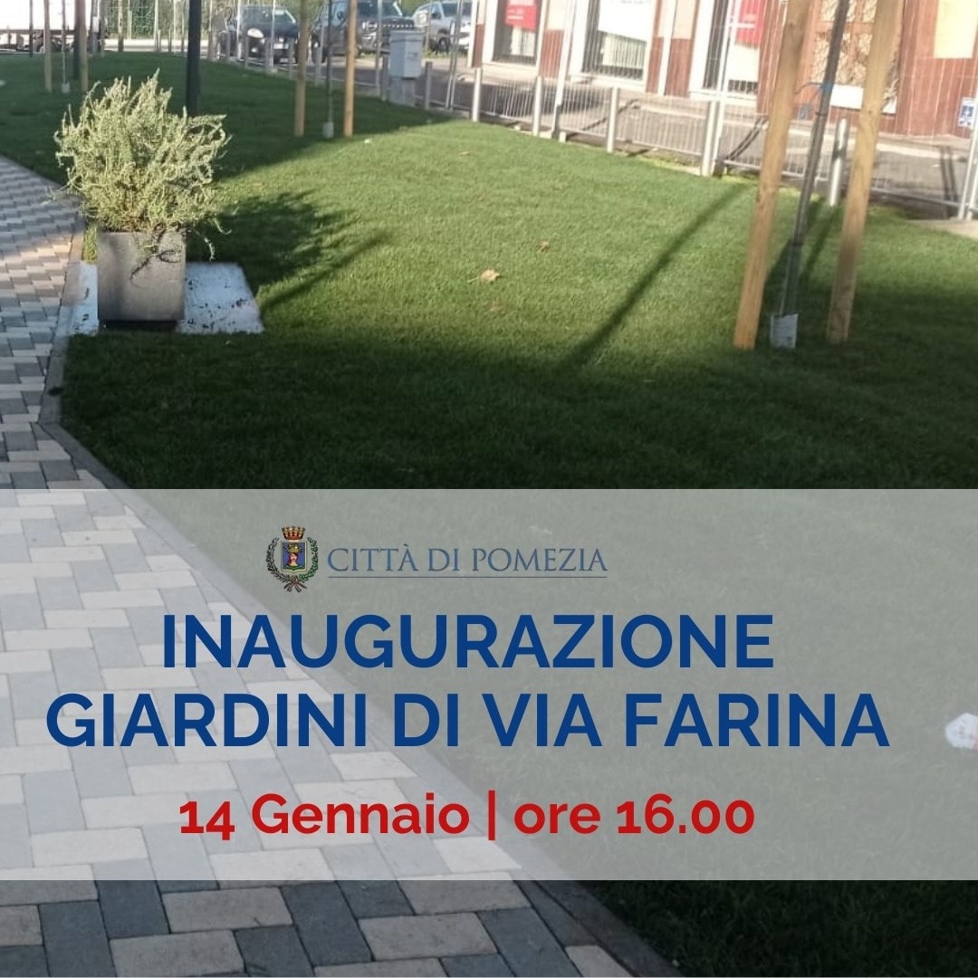 A Pomezia questo mercoledì 14 gennaio, alle 16.00, l’inaugurazione dei giardini di Via Farina e dell’area verde tra Via del Mare e Via Roma. Entrambi sono stati oggetto di un importante intervento di riqualificazione urbana.