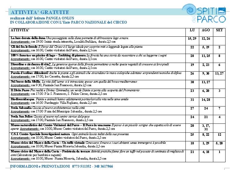 Informazioni e prenotazioni: 0773.511352 oppure 348.3617966 - Info su www.parcocirceo.it - www.istpangea.it