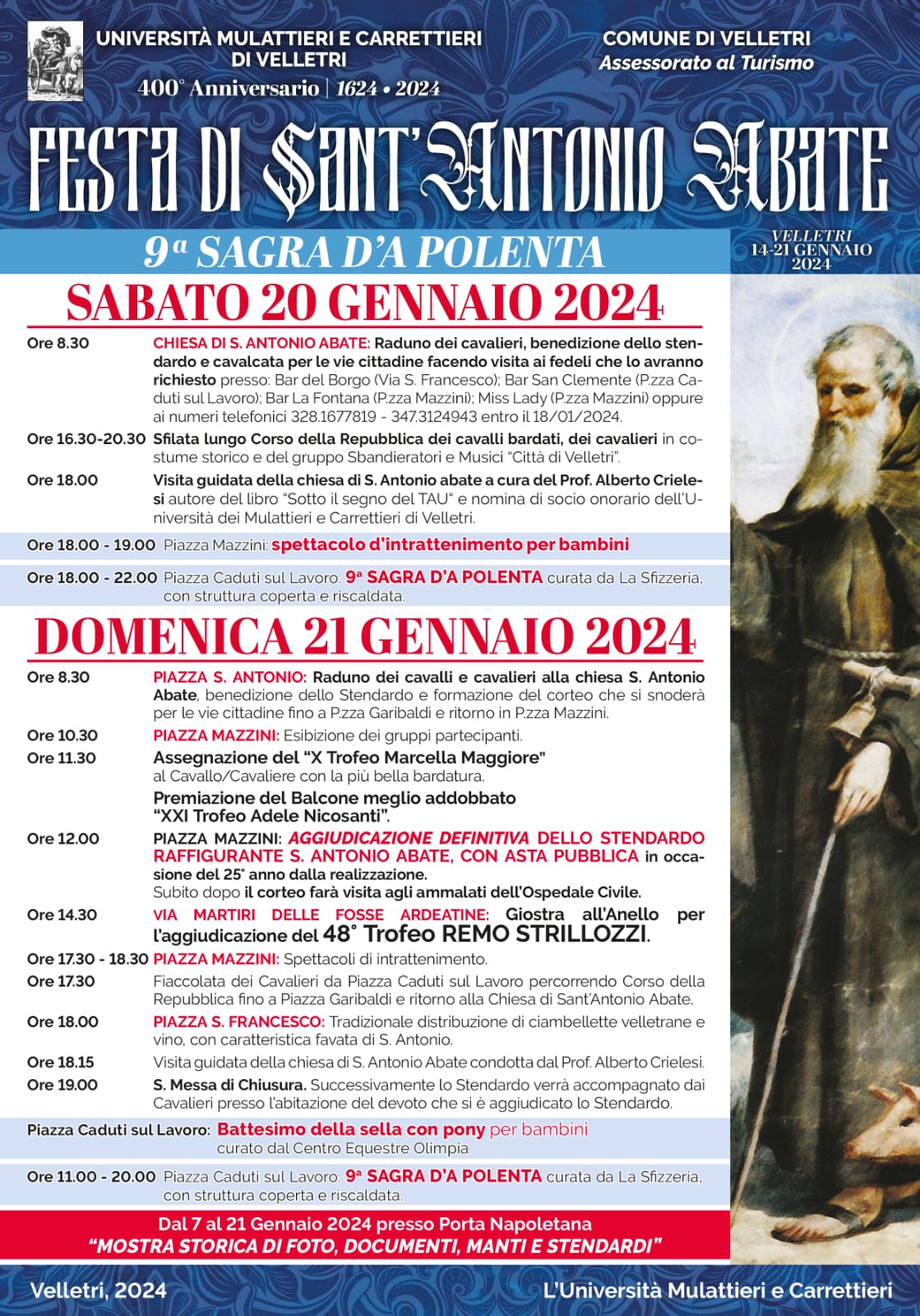 Oggi e domani, domenica 21 Gennaio, torna la tradizionale “Festa di Sant'Antonio Abate” a Velletri ed anche la “Sagra della Polenta”.Nel 400° anniversario della fondazione dell’Università dei Mulattieri e Carrettieri di Velletri, in città si svolgeranno nel fine settimana una serie di iniziative.