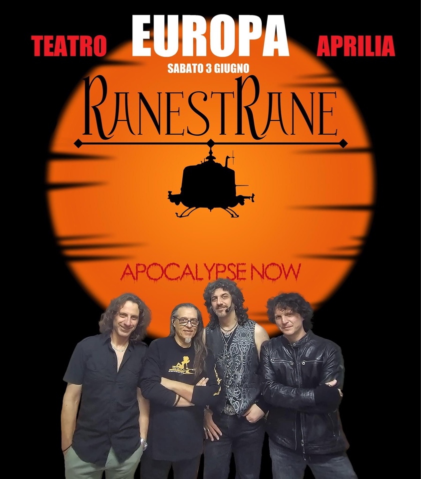 Sabato 3 giugno al Teatro Europa di Aprilia approda l’“Apocalypse Now Tour” della band prog rock Ranestrane. L’organizzazione è a cura dell’associazione culturale “Inversione a U” di Aprilia. Ad aprire il concerto delle RanestRane, direttamente da Sanremo Rock Festival, saranno gli Zephyro, band locale molto conosciuta e apprezzata. La serata avrà inizio alle 20.30.