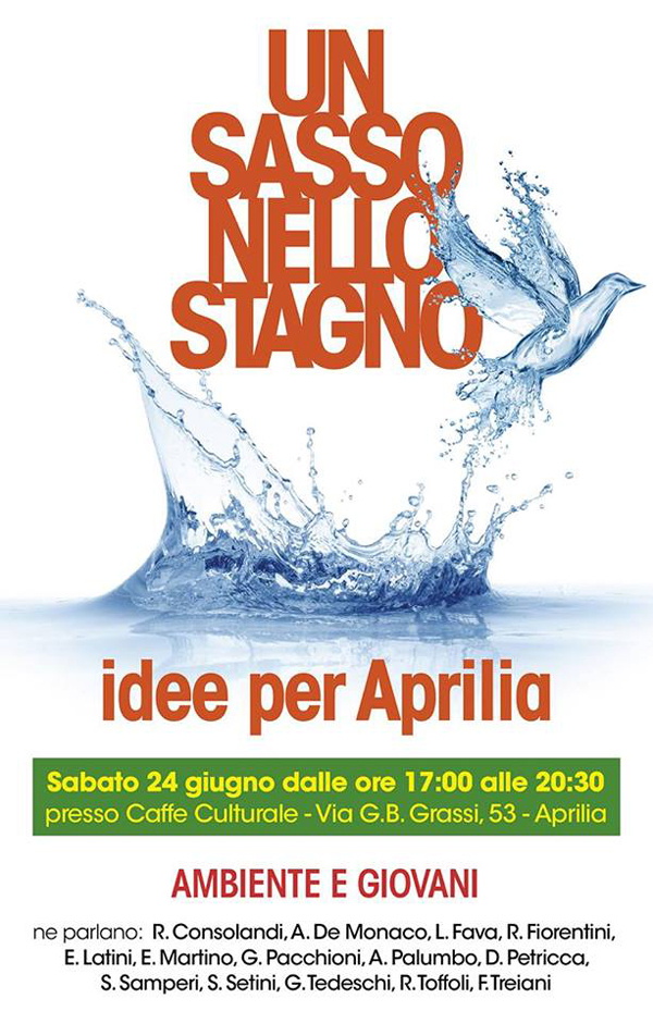 Domani pomeriggio ad Aprilia, dalle 17 alle 20.30, presso il Caffè culturale si svolgerà una iniziativa dal titolo “Un sasso nello stagno – idee per Aprilia”.