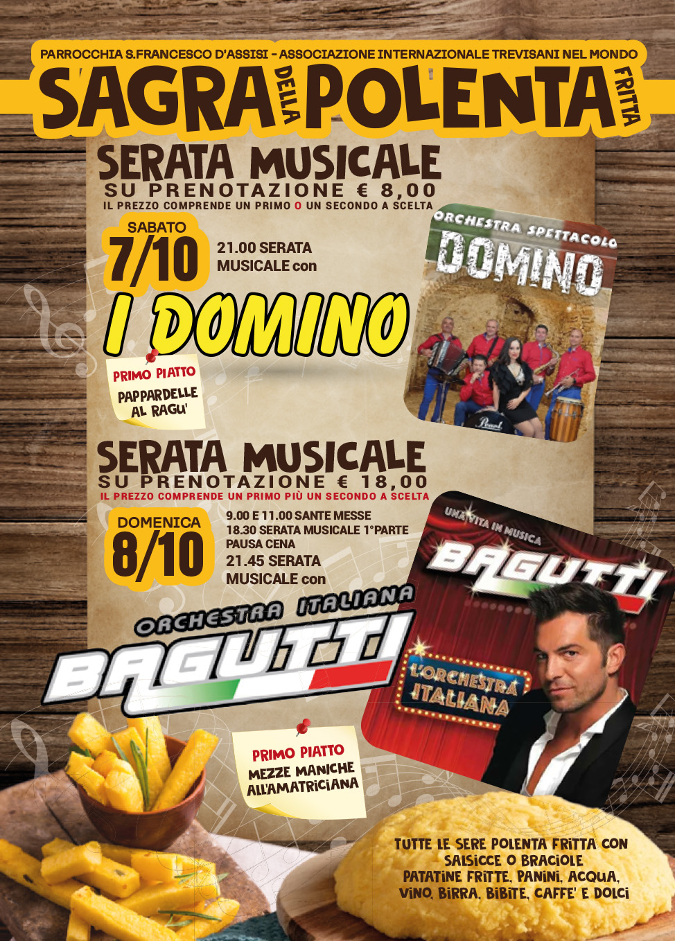 Ci sarà, naturalmente, anche la polenta fritta con salsicce o braciole, patatine, panini, acqua, vino, bibite, caffè e dolci