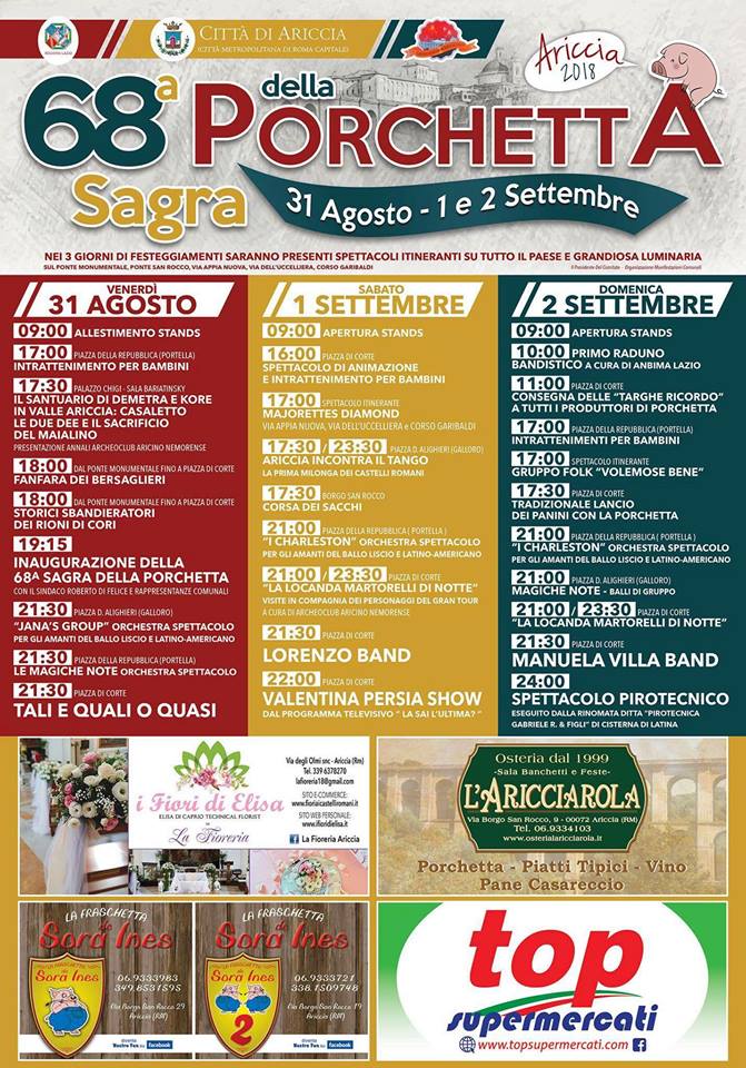Torna la Sagra della Porchetta di Ariccia. L’appuntamento è da venerdì 31 agosto a domenica 2 settembre. L’evento è giunto alla 68esima edizione. Come ogni anno stand gastronomici in piazza ed intrattenimento. L’inaugurazione della sagra è prevista venerdì alle 19.00. In serata, in piazza di Corte lo show dei Tali e Quali, sabato sera ci sarà invece la comicità di Valentina Persia, mentre domenica 2 settembre si chiude con Manuela Villa e i fuochi d’artificio.