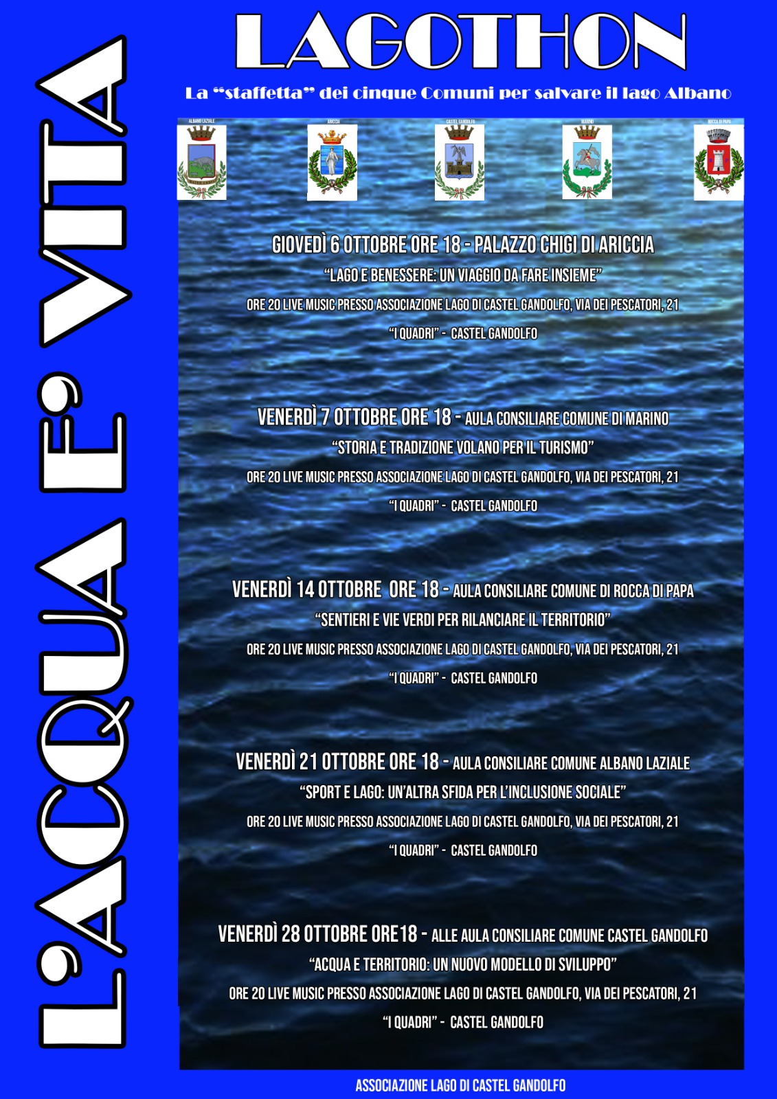 “Lago e Benessere: un viaggio da fare insieme” è il titolo dell’incontro che si terrà questo giovedì 6 ottobre, alle 18.00, al Palazzo Chigi ad Ariccia. L’iniziativa promossa dall’Associazione Lago di Castel Gandolfo è la prima di cinque appuntamenti che vedono impegnati i comuni di Ariccia, Marino, Rocca di Papa, Albano e Castel Gandolfo in una campagna di sensibilizzazione a difesa del Lago Albano.