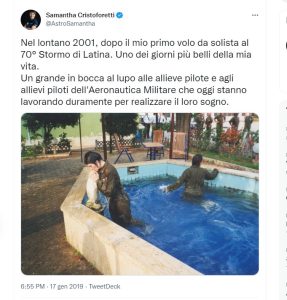 Il primo ottobre scorso Samantha Cristoforetti aveva salutato Latina dallo spazio. Ma la città se ne è accorta solo oggi grazie a un articolo pubblicato sul quotidiano Il Messaggero. “Latina, where young Air Force pilots earn their first wings”, scrive su Twitter, riferendosi al 70° stormo dove vengono addestrati i futuri piloti dell'Aeronautica Militare e di altre forze armate e corpi armati dello Stato, iter che ha seguito anche AstroSamantha, che già nel 2019 aveva twittato ricordando la sua esperienza nel 2001 e il suo primo volo da solista proprio nell’aeroporto pontino.