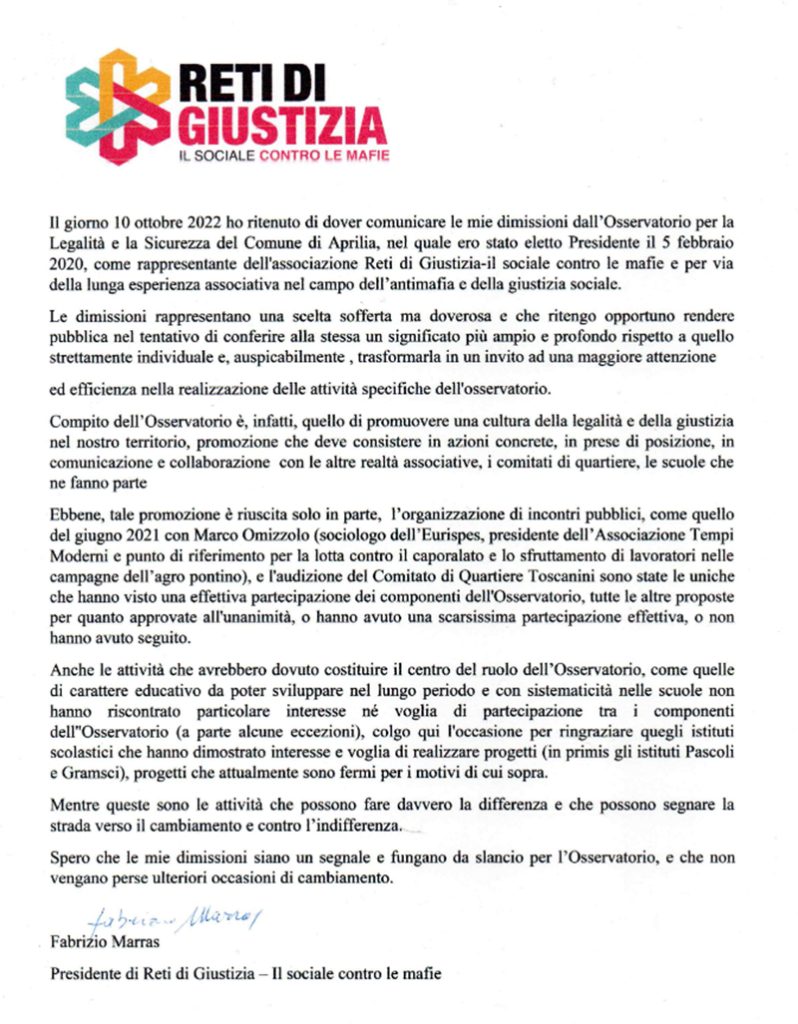 “Scarsa partecipazione nel promuovere la cultura della legalità e della giustizia sul territorio ed iniziative appese al palo”. Fabrizio Marras (presidente di Reti di Giustizia-Il Sociale contro le mafie) dopo oltre due anni, lascia la presidenza dell’Osservatorio per la Sicurezza e la Legalità del Comune Aprilia. “Una scelta sofferta, ma doverosa. – scrive Marras in una lettera, rendendo pubbliche le dimissione presentate già lo scorso 10 Ottobre – Spero che le mie dimissioni siano un segnale e fungano da slancio per l’Osservatorio, e che non vengano perse ulteriori occasione di cambiamento”.