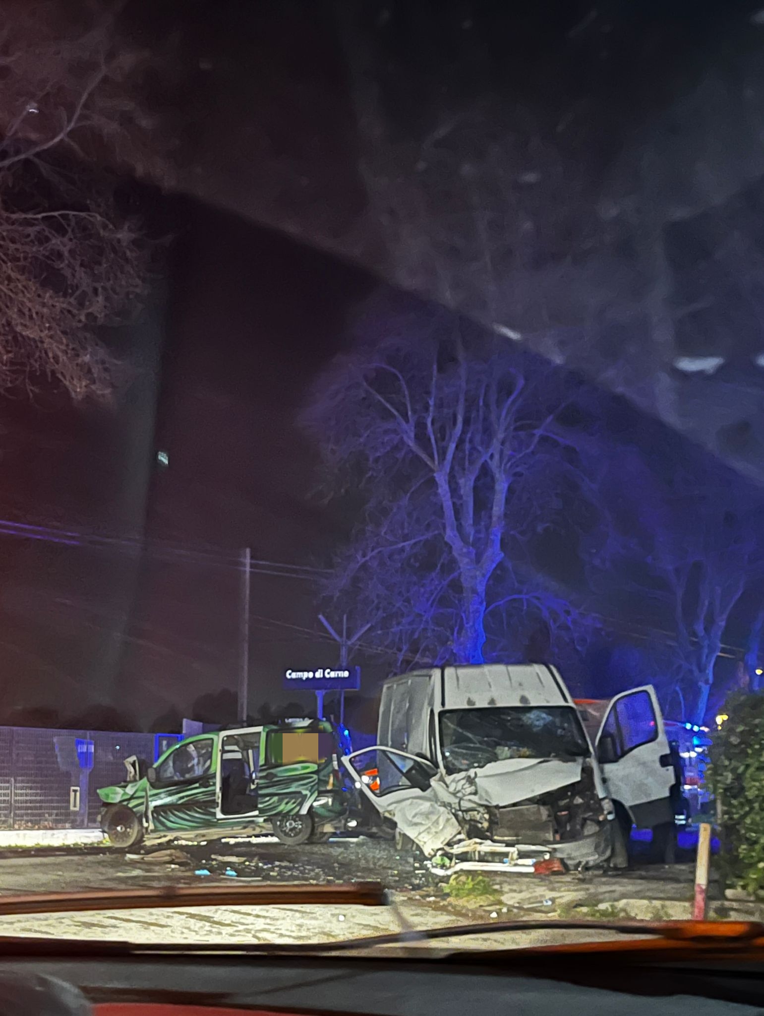 Schianto tra due furgoni in tarda serata sulla via Nettunense, a Campo di Carne. La strada viene chiusa al traffico.