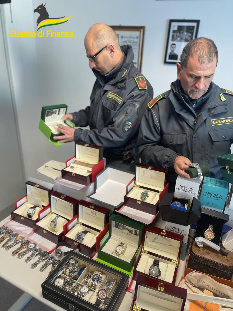 La perquisizione dell’abitazione di un soggetto residente a Ladispoli ha permesso di rinvenire orologi e capi d’abbigliamento con marchi falsificati di brand di fama internazionale, tra cui Rolex, Cartier, Omega, Swatch, Patek Philippe, Versace, Louis Vuitton, Gucci, Dior, Fendi, Valentino, Adidas, Nike, Moncler e Apple.