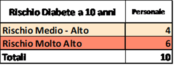 I risultati ottenuti dallo screening per rischio diabete tipo 2, da un lato evidenziano 11 persone con rischio molto basso, dall’altro lato si sono registrati 4 casi a rischio diabete medio alto e 6 persone con rischio molto alto.