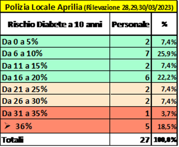 Ecco quindi che, dopo gli screening all’IIS “Rosselli”, il Presidente dell’Associazione SIPOD APS di Aprilia, Dr. Alessandro Tempesta, ha proposto lo screening al comandante della nostra Polizia Locale di Aprilia.Il comandante, Dr. Massimo Giannantonio, ha accolto con favore la proposta e ha informato il personale. Ben 27 persone hanno aderito, spontaneamente e su base volontaria, al progetto promosso da SIPOD APS Aprilia, “Conoscere e prevenire Obesità e Diabete”. Nei giorni 28, 29, e 30 marzo sono stati realizzati screening per valutare il rischio di obesità (valutando peso, altezza, circonferenza vita) e diabete utilizzando il questionario (Findrisc o Diabetesrisk score)e il test della glicemia, presso il comando della Polizia Locale di Aprilia