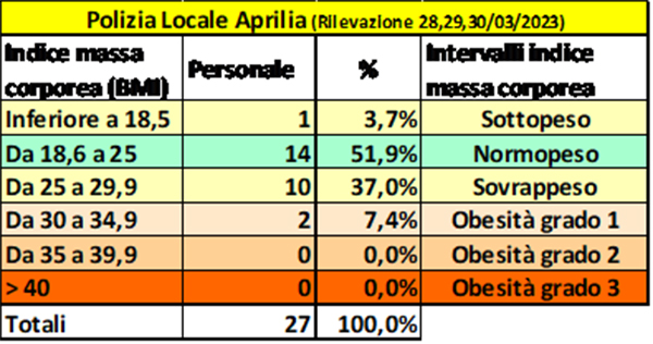 La valutazione del rischio Obesità ha evidenziato un buon profilo della nostra polizia locale, 1 persona è risultata in lieve sottopeso ma fisiologico, 10 persone sono risultate in sovrappeso, mentre 2 sono le persone con 1° grado di obesità, mentre 14 persone, pari al 52% circa del totale screening effettuati, sono normopeso.