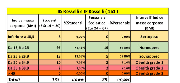 30 studenti risultano in sovrappeso o obesi (22% sul totale studenti controllati), 9 persone del personale sono risultate in sovrappeso o obesi (32% totale personale scolastico controllato). A fronte di questi dati le conclusioni sono: Innanzitutto l’adesione degli studenti e del personale non docente dell’istituto Rosselli all’iniziativa di screening testimonia che la prevenzione inizia ad essere considerata.