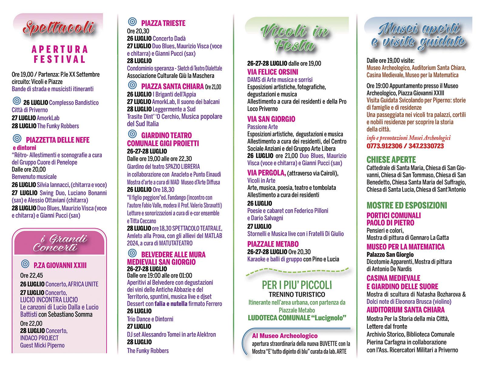 Da oggi a domenica 28 Luglio, dalle ore 19.00, “Svicolando Suoni, Sapori e Suggestioni a Priverno Città d’Arte” , vedrà i principali luoghi del centro storico della Città, vicoli, piazze, palazzi e cantine, mutare in grandi palcoscenici a cielo aperto, con visite guidate, mostre, musica di benvenuto, street band, trenino itinerante, intrattenimento tout-court per bambini, vicoli in festa, tra allestimenti originali e progetti a tema realizzati dai residenti, spettacoli teatrali e spettacoli musicali nelle piazze, dal rock al jazz, dallo swing al blues, al folk balcanico e popolare, fino ad arrivare al grande reggae italiano, in una dinamica interazione tra persone, storie, luoghi e identità.