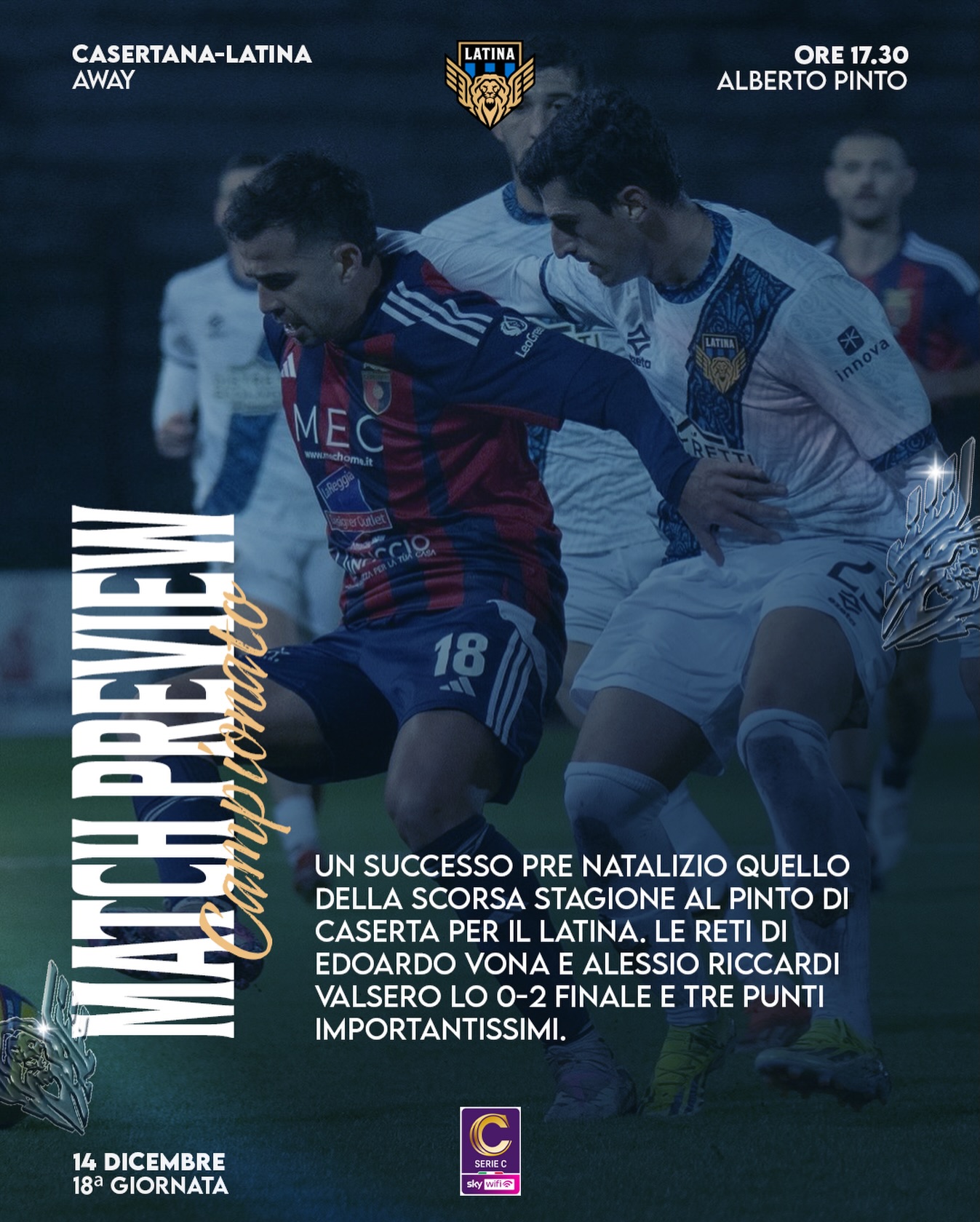 Calcio di serie C, 18esima giornata. Ultima trasferta dell’anno per il Latina, la terza consecutiva. Si gioca allo stadio “Alberto Pinto” contro i padroni di casa della Casertana. Il match è in progra...