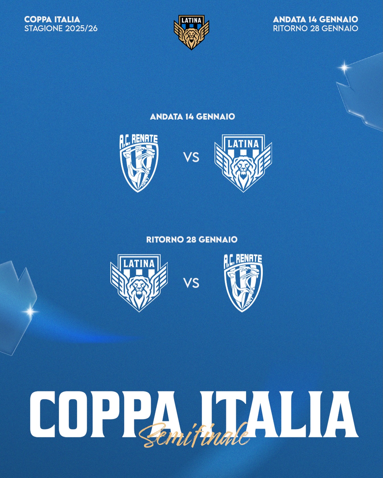 Intanto, ieri è stata ufficializzata l’avversaria del Latina nella semifinale di Coppa Italia: si giocherà contro Renate. L’andata è in programma per il 14 Gennaio, in trasferta; la gara di ritorno si giocherà al “Domenico Francioni” il 20 Gennaio.