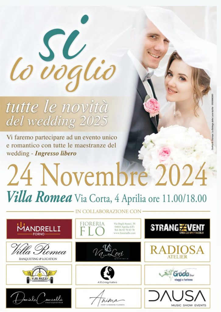 “Sì lo voglio”: questa domenica 24 Novembre a “Villa Romea”, in via Corta, 4 ad Aprilia, un evento dedicato agli sposi e dove le giovani coppie - ma non solo - troveranno un professionista a disposizione per ogni categoria legata al matrimonio.