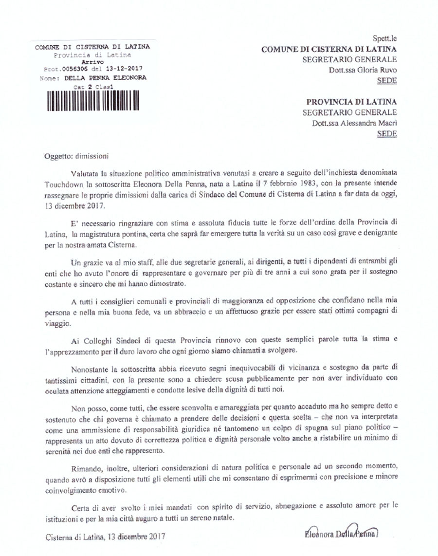 Questa mattina il Sindaco di Cisterna di Latina, Eleonora Della Penna, con un una nota indirizzata al Segretario generale dell’Ente, ha rassegnato le proprie dimissioni. Una scelta giunta oggi dopo che lunedì scorso l'inchiesta Touch Down ha portato ad arresti in Comune per appalti e tangenti. In un primo momento la sindaca non voleva dimettersi, nonostante le richieste insistenti dell'opposizione. Poi il ripensamento.