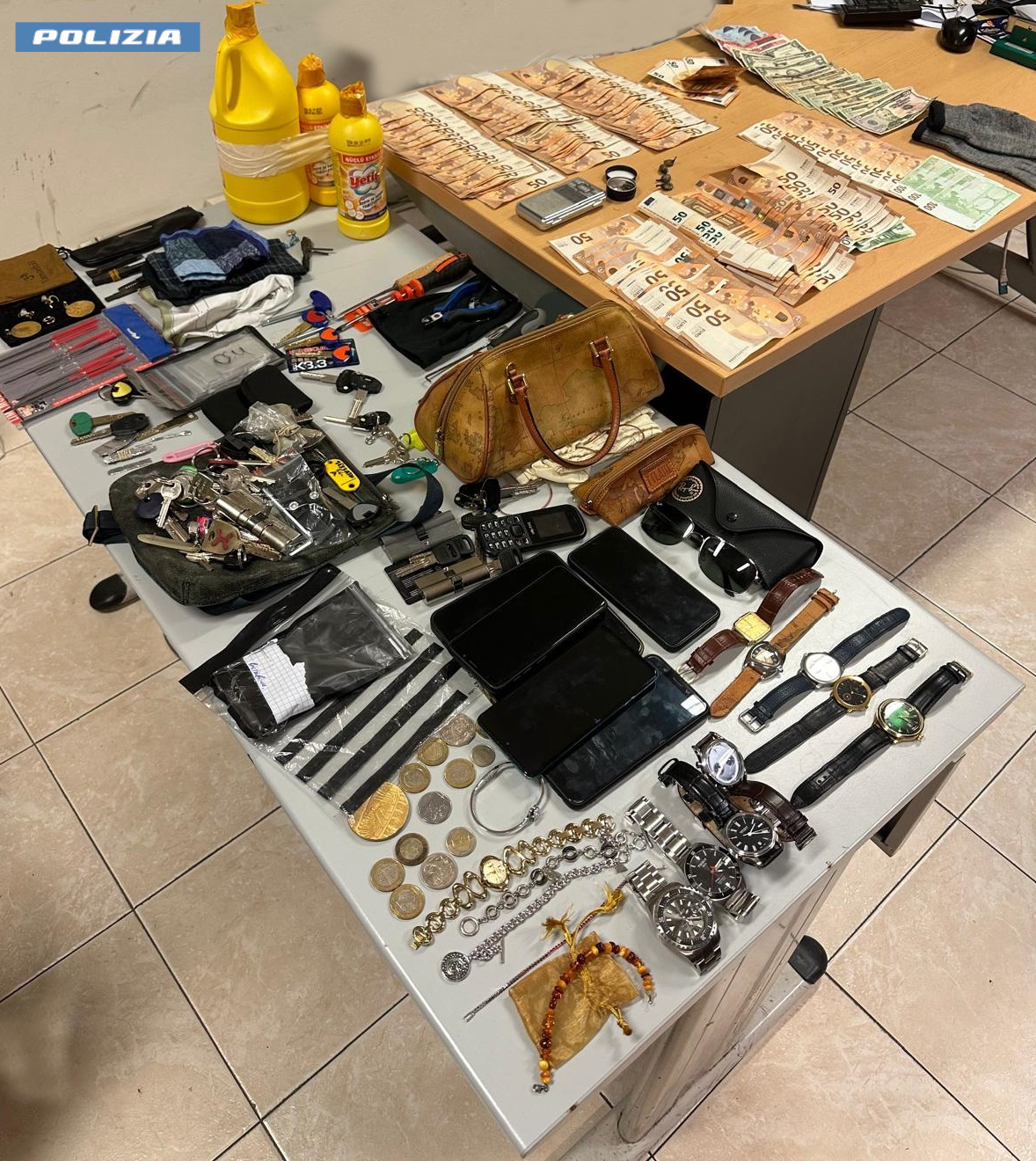 A quel punto, gli investigatori hanno fermato e controllato le auto rinvenendo, all’interno delle stesse, grimaldelli, monili in oro, mazzi di chiavi, nonché numerose lamelle in alluminio utilizzate dai ladri come segna porte, il tutto occultato sotto la fodera dei tettucci dei veicoli. Successivamente, i poliziotti si sono recati presso la struttura in cui i tre uomini alloggiavano dove, all’interno di una stanza, hanno rinvenuto e sequestrato numerosi gioielli, orologi, grimaldelli e attrezzi utilizzati per la riproduzione di chiavi, oltre alla somma di 7.200 euro in contanti; infine, gli operatori hanno trovato alcune bottiglie contenenti dell’acido utilizzato per forzare le serrature.