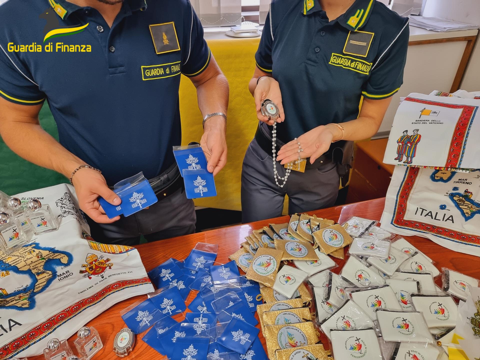 Durante i controlli, sono stati scoperti e sequestrati articoli religiosi irregolari, tra cui rosari, pendagli, bracciali e medagliette, recanti immagini sacre, stemmi del Vaticano e il logo ufficiale del Giubileo, riprodotti illegalmente in violazione della normativa sulla proprietà intellettuale.