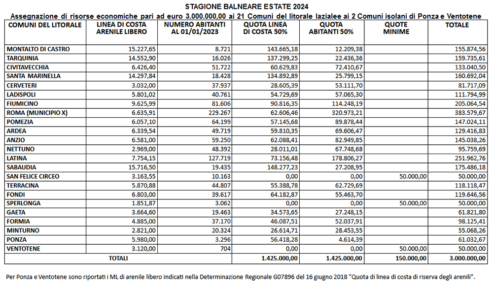 “Il budget per il 2024 è stato incrementato, rispetto allo scorso anno, di 500mila euro - spiega la Regione Lazio - passando, per l’appunto dai 2,5 milioni del 2023 ai 3 milioni di quest’anno. Sono 21 i Comuni laziali, tutti con arenili accessibili, interessati allo stanziamento. A questi si aggiungono anche i 2 comuni isolani di Ponza e Ventotene.