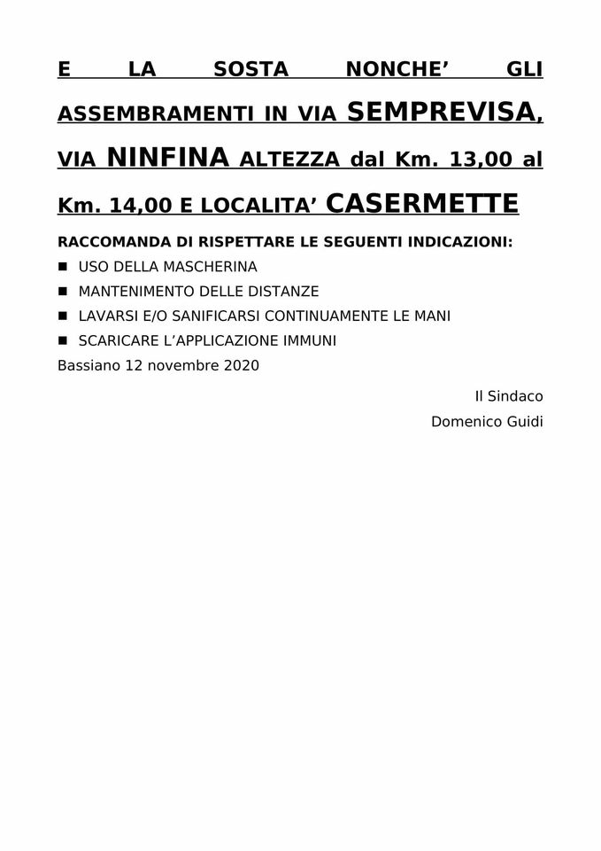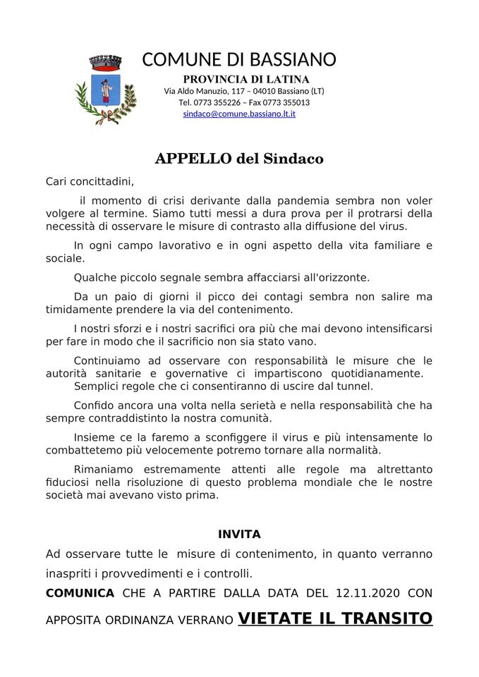 Ordinanza del sindaco a Bassiano contro gli assembramenti. Il primo cittadino Domenico Guidi ha emesso un provvedimento vietando il transito e la sosta in via Semprevisa, in via Ninfina e in località Casermette.