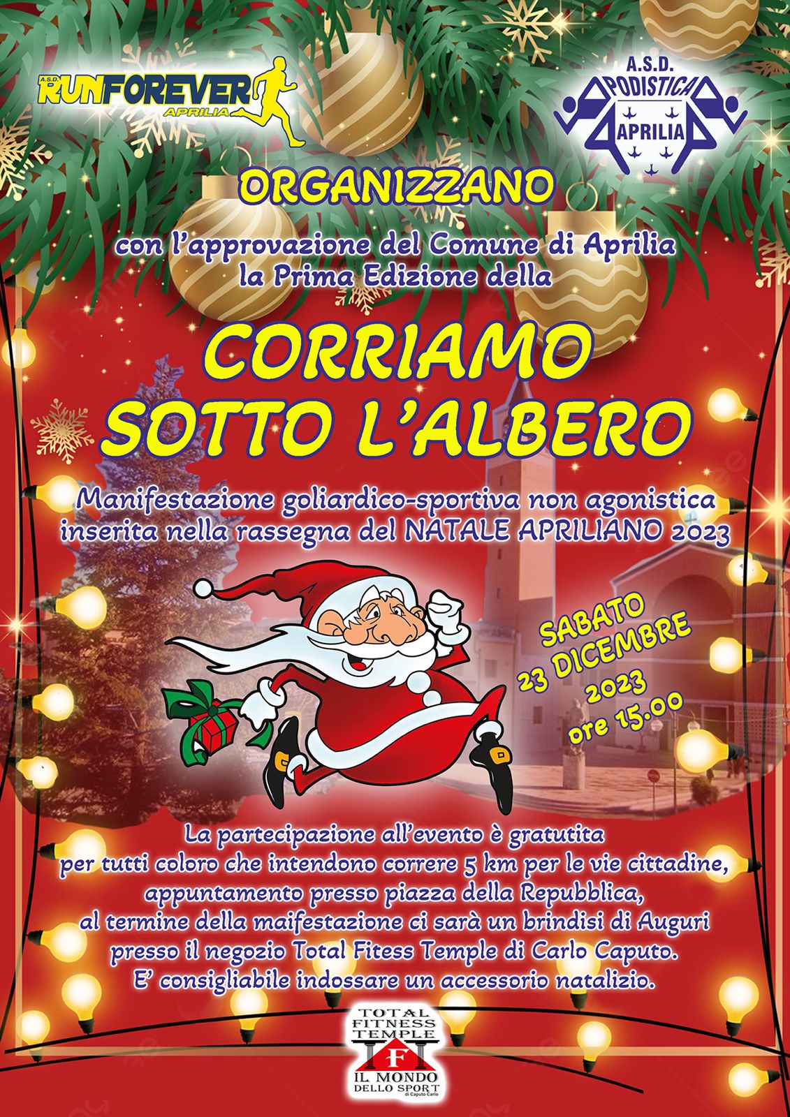 Successo per la prima edizione di “Corriamo sotto l’Albero” organizzata dalla Podistica Aprilia e dalla Runforever Aprilia. Le due società presenti sul territorio apriliano quest’anno hanno unito gli sforzi per regalare alla Città un evento podistico goliardico non competitivo, sotto l'egida del Comune, che lo ha inserito nel programma del Natale Apriliano 2023.