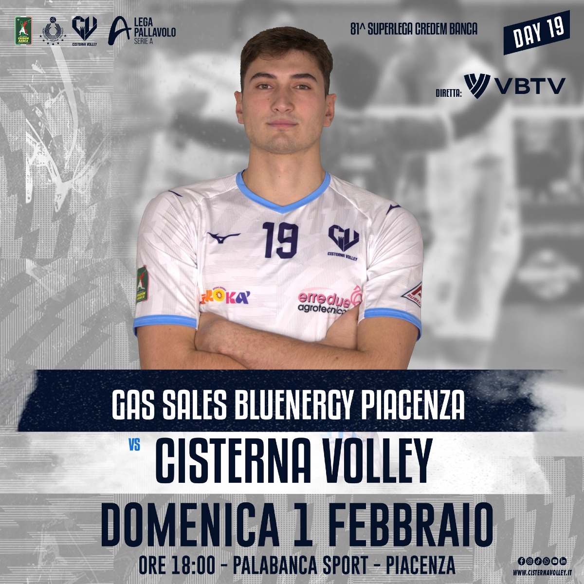 Pallavolo di Superlega, 4 gare alla fine della Regular Season. Il Cisterna Volley parte dalla trasferta di questa domenica a Piacenza, in Emilia. Alle 18.00 si scende in campo contro i locali della Gas Sales Bluenergy. I pontini domani devono difendere 6 punti di vantaggio sul fondo della classifica, dove si trova Grottazzolina. Poi arriverà la sosta, prima del rush finale. Il campionato riprende a metà febbraio con la nona di ritorno: domenica 15 febbraio Cisterna ospiterà Cuneo.