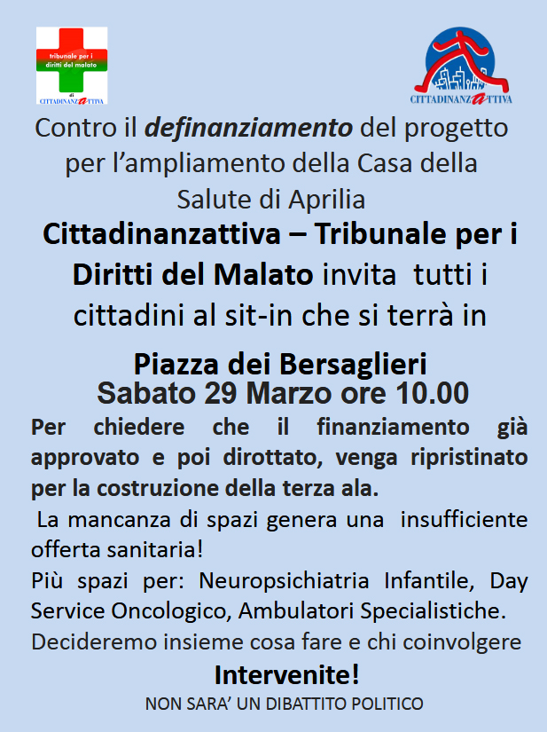 Tagli alla sanità ad Aprilia: questo sabato mattina il sit-in del Tribunale per i Diritti del Malato in piazza dei Bersaglieri.