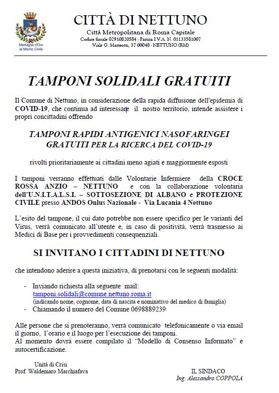 "Ringrazio tutti i componenti dell'Unità di Crisi del Comune di Nettuno, con particolare riguardo al Professor Waldemaro Marchiafava - dichiara il Sindaco Alessandro Coppola - per il grande lavoro messo in campo per organizzare questo progetto che consentirà al 10% della popolazione di effettuare gratuitamente il test rapido per l'individuazione del Coronavirus. Un ringraziamento particolare va all'Andos che metterà a disposizione la location dove verranno eseguiti i tamponi, alle sorelle infermiere della Croce Rossa Italiana che eseguiranno i test e ai volontari dell'Unitalsi, dell’Associazione Nettuno ODV di Protezione Civile, del Nucleo Associazione Nazionale Carabinieri Protezione Civile Anzio Nettuno e della Società Nazionale di Salvamento Sezione Anzio-Nettuno per la loro preziosa collaborazione a questo importante progetto del Comune di Nettuno".