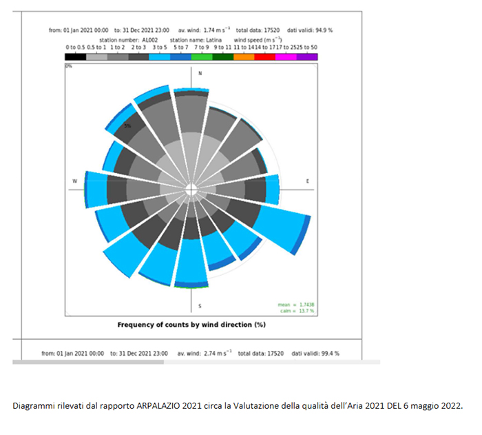 Il diagramma che segue, indica i venti che hanno interessato nel 2021 la stazione di rilevamento di Latina. Lo stesso fornisce la direzione, la percentuale annua di persistenza e la velocità in metri al secondo.
