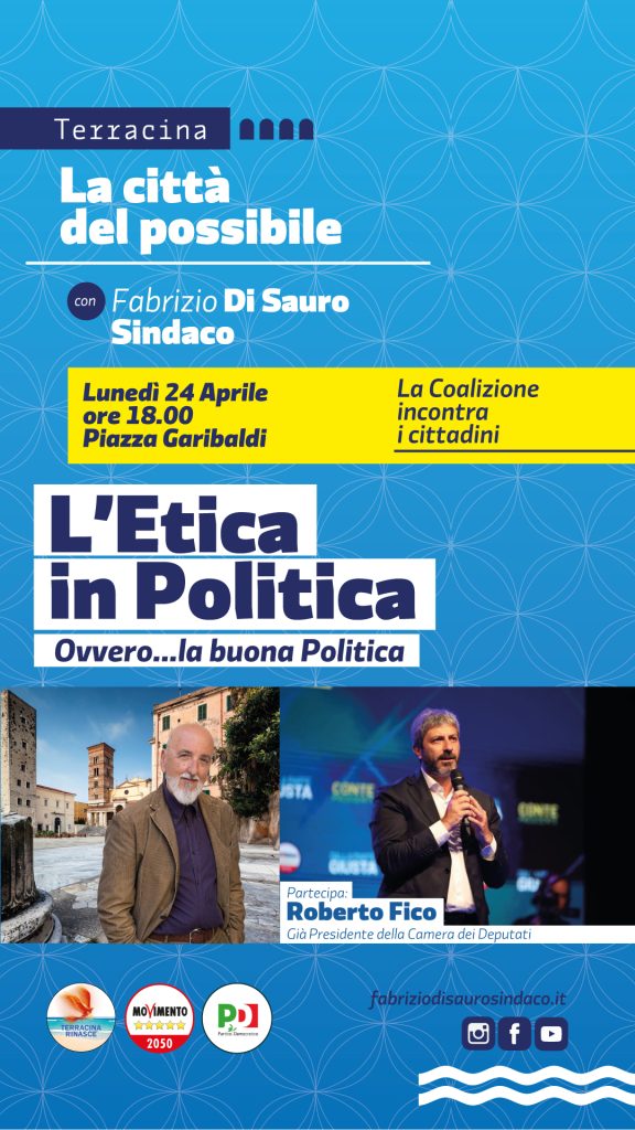 “La città del possibile”, la coalizione che sostiene il candidato sindaco di Terracina Fabrizio di Sauro ha organizzato per lunedì 24 aprile un incontro pubblico in piazza Garibaldi. Ci sarà anche Roberto Fico, ex presidente della Camera dei Deputati.