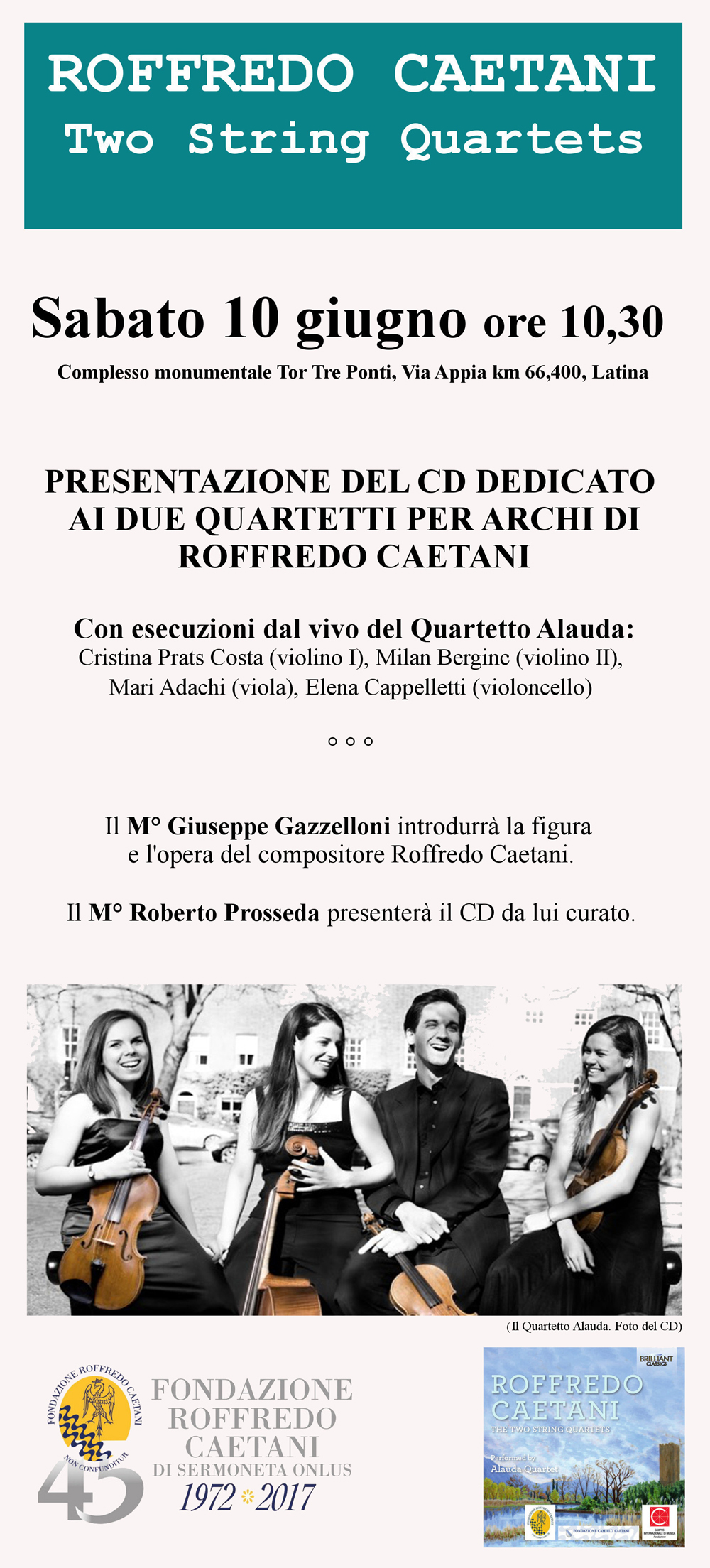 Sabato 10 giugno a Latina, presso il Complesso monumentale “Tor Tre Ponti” - in occasione del 45esimo dell'istituzione della Fondazione Roffredo Caetani di Sermoneta - sarà presentato il cd musicale dedicato ai due quartetti per archi di Roffredo Caetani, musicista e compositore. L’appuntamento - con esecuzioni dal vivo del Quartetto Alauda - è alle 10.30. L’ingresso è libero.