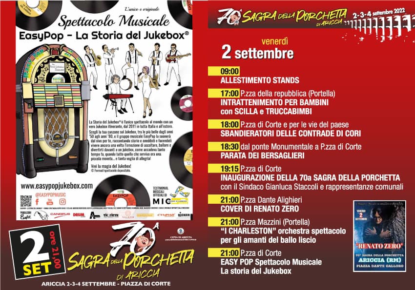 Venerdì 2 Settembre la sagra si apre ufficialmente alle 19.15. In serata, il concerto di una cover band di Renato Zero.